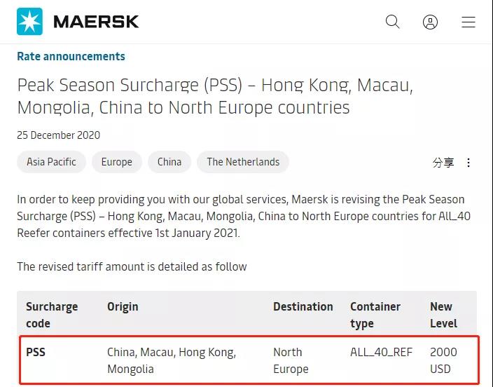 أصدرت شركة ميرسك إعلانًا يفيد بأنه اعتبارًا من 1 يناير 2021 ، سيتم فرض رسوم إضافية على الحاويات المبردة بطول 40 قدمًا من البر الرئيسي للصين وهونج كونج وماكاو ومنغوليا إلى منطقة الشمال الأوروبي ، اعتبارًا من 1 يناير 2021 ، كرسوم إضافية لموسم الذروة تبلغ 2000 دولار أمريكي لكل صندوق.